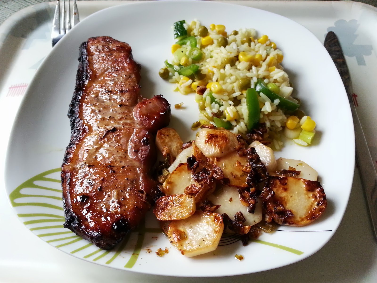 I have always liked special rice. White boiled rice on its' own I find very bland but add a few peas, sweetcorn and chopped spring onions with salt and black pepper and you have a much tastier dish and accompanies the pork on the left.